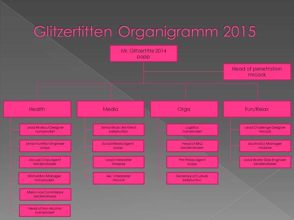 so langsam wird es ernst. Es sind noch gut 5 Tage bis zu unserem legendären Urlaub auf #Tenelifta. Damit auch alles so hinhaut, wie wir uns das vorstellen und damit ihr natürlich auch auf eure Kosten kommt, haben wir hinter der Bildfläche ein wenig die Zuständigkeiten und Rollen geklärt. Hiermit präsentiere ich euch voller Stolz das Glitzertitten-Organigramm 2015!